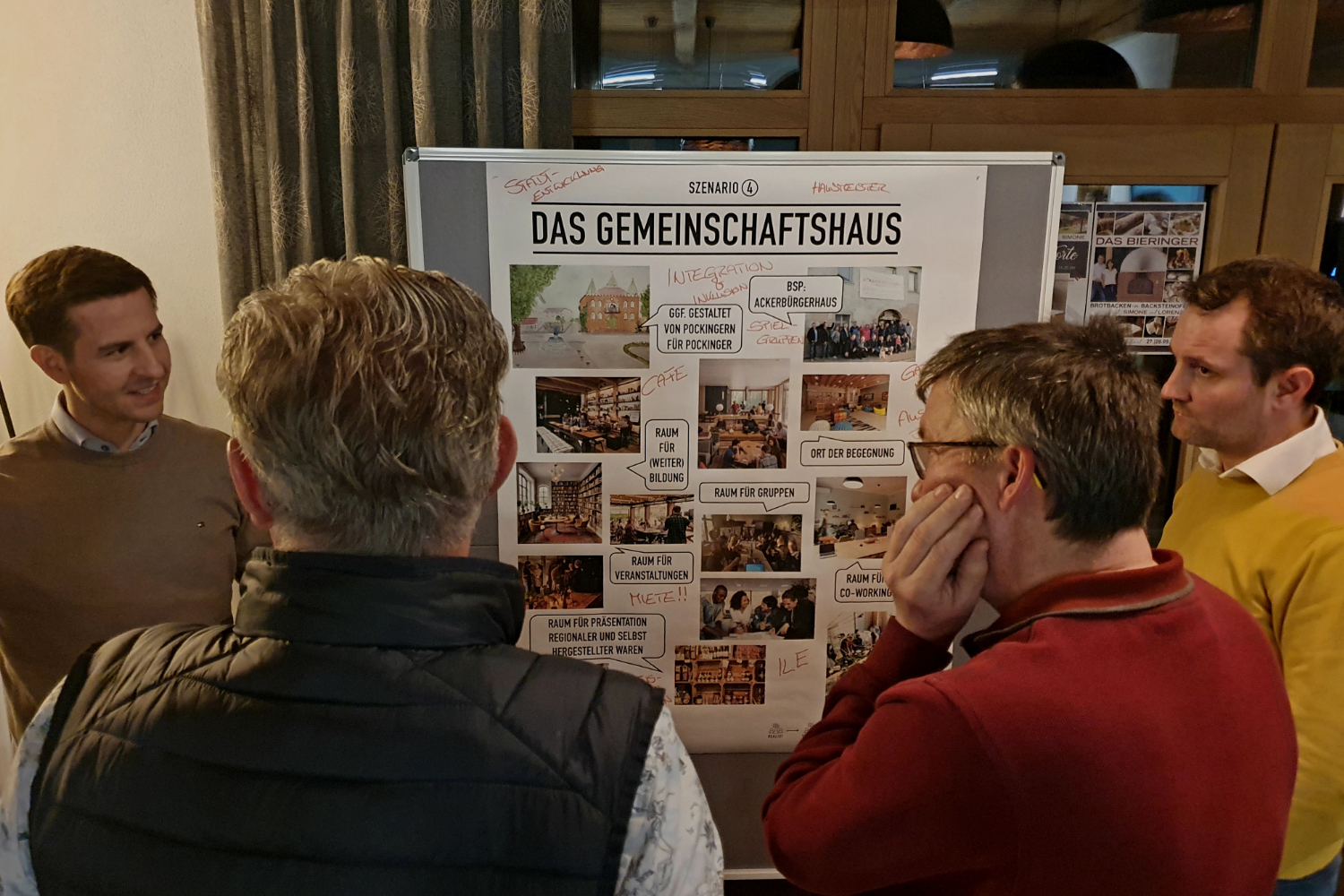 Nach dem Stadtbesuch ging’s weiter zum Workshop im DAS BIERINGER in Willenbach, moderiert von Querfeld.Design. Dort entwickelten die Teilnehmer:innen gemeinsam Szenarien und Ideen für die zukünftige Nutzung des Gebäudes – offen, kreativ und zielorientiert.